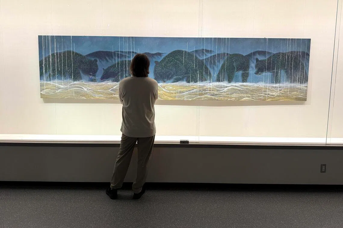 Nagasawa Aoi’s blue-toned paintings of bears depict an unspoilt Eden where flora and fauna seem to exist in a peaceful idyll. Her works, however, are based on gritty real-life experience – the Akita-born artist grew up fishing and hunting, and is intimately acquainted with the process of butchering game.