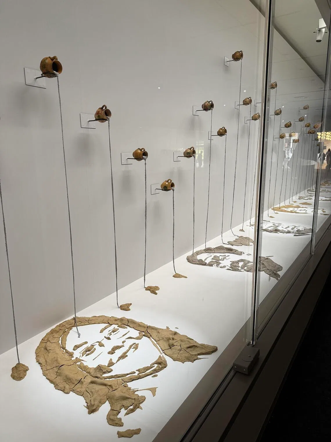 The tiny ceramic vessels are based on traditional ones used by indigenous people. The pots are filled with concrete, but the concrete dripping down changes to clay and, as it reaches the ground, forms portraits of important women in Bor’s community.