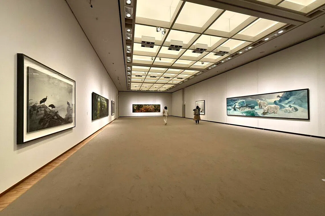 An installation view of Sugimoto Hiroshi’s Dioramas series and the mural paintings of Higashiyama Zoo at the Aichi Arts Center.
