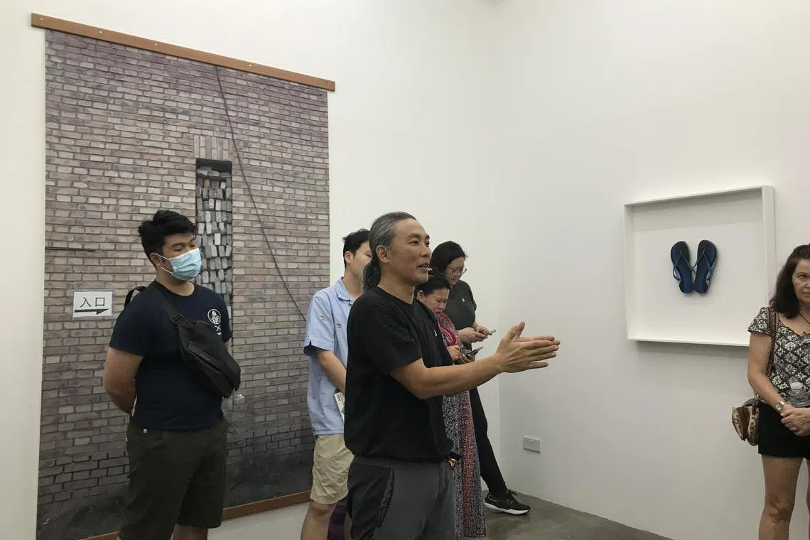 Artist Sai (with outstretched hands) talking about his artworks at his studio in Jalan Pemimpin.