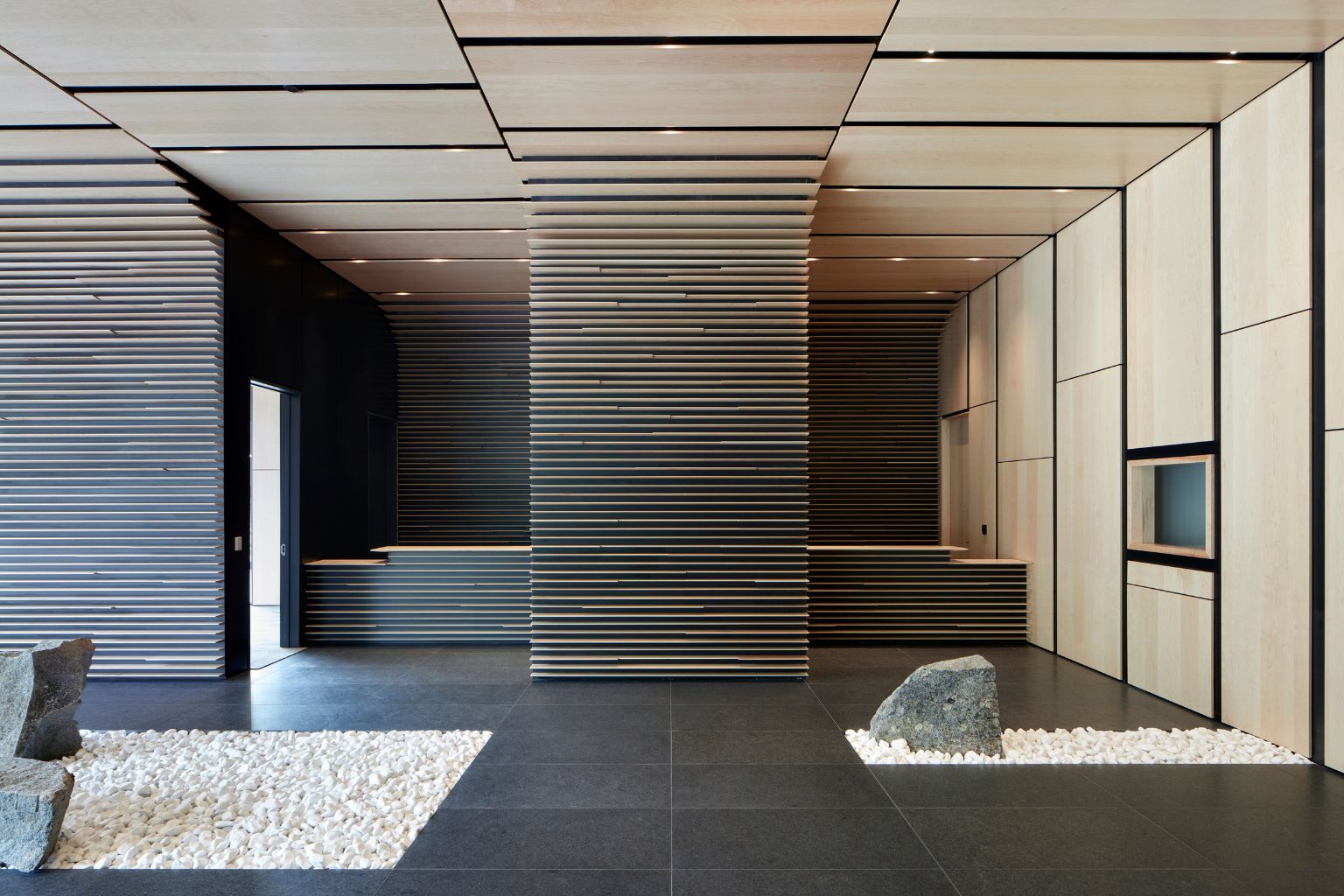 He explains: “Usually, office buildings are independent monuments, and the building is separate from the land around it. So I thought of starting with the landscape by connecting the building to the ground with a low Japanese castle wall, and twisted the building to show the continuous movement from terrain to building.”