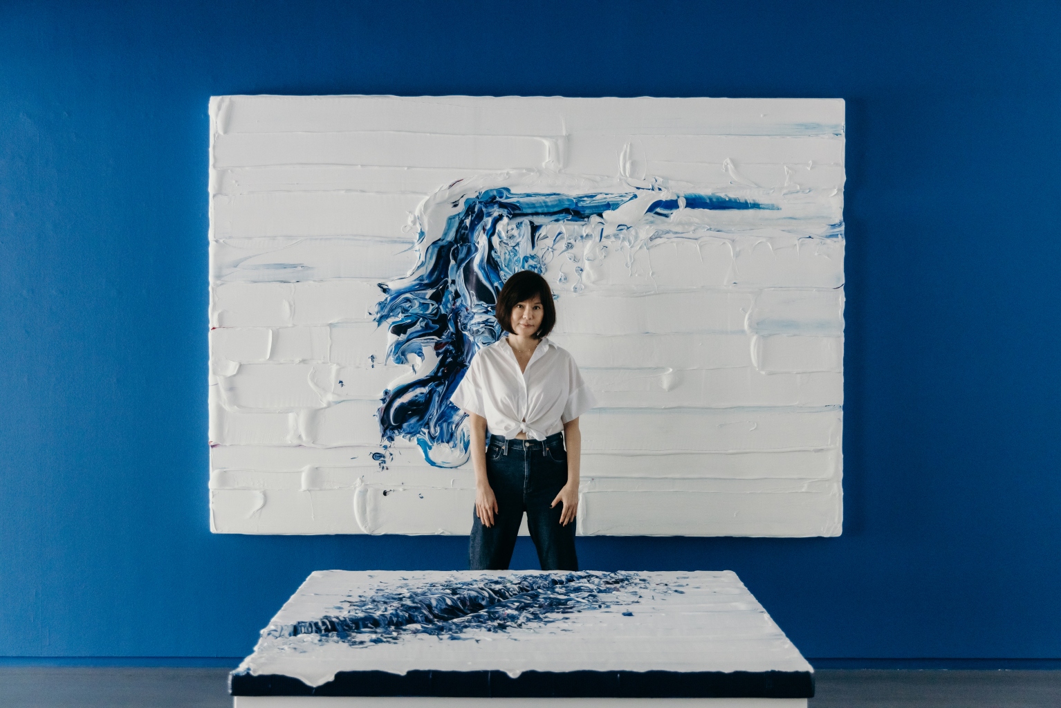 Artist Jane Lee with her artwork titled Where Is Painting #2 (2023) hanging on the wall.