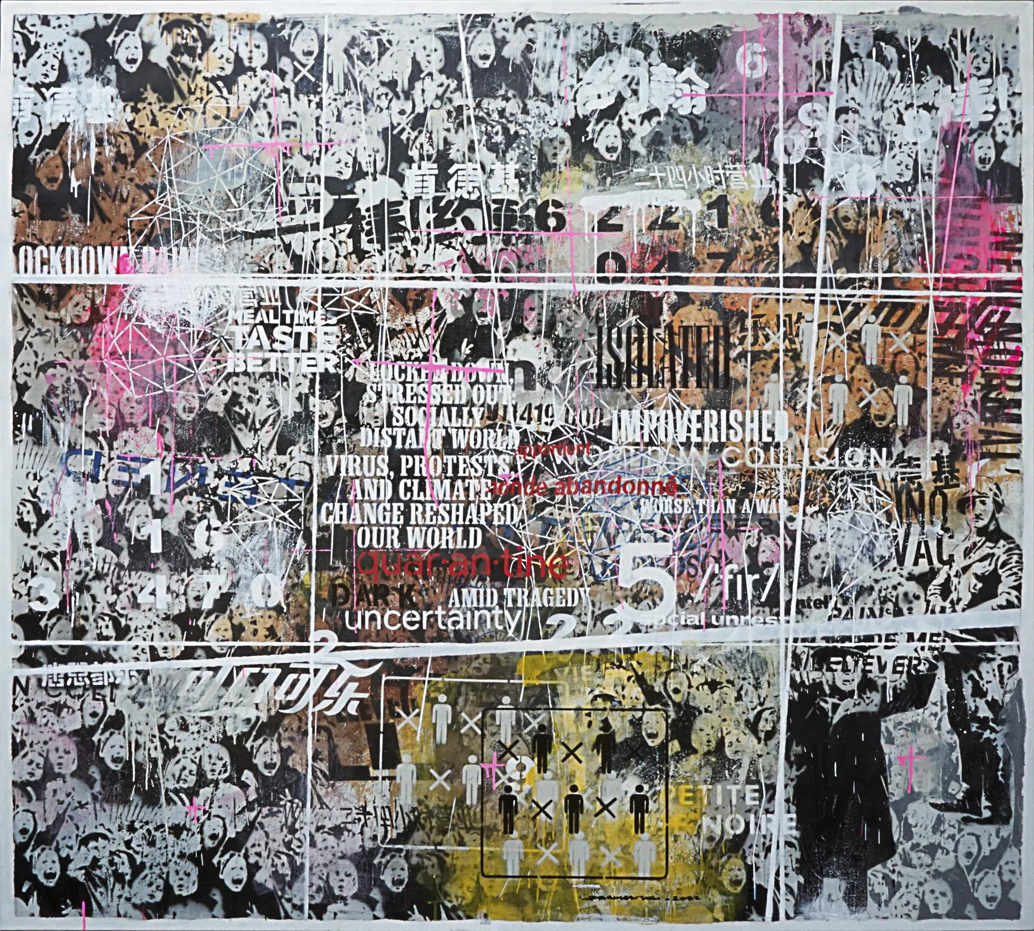 The artist, who also won the United Overseas Bank UOB Painting of the Year (Indonesia) award in 2022, uses stencils as well. In the work titled Life In Uncertainty (2022), stencilled text and various appropriated symbols of urban life on canvas read like a secret, cryptic message.