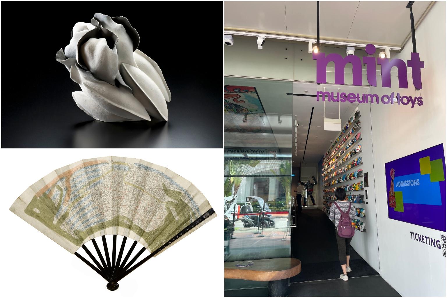 (Clockwise from top left) Fujino Sachiko’s Forming A Voice - White, the entrance to the Mint Museum of Toys, and a fan with a map of China and Beijing.