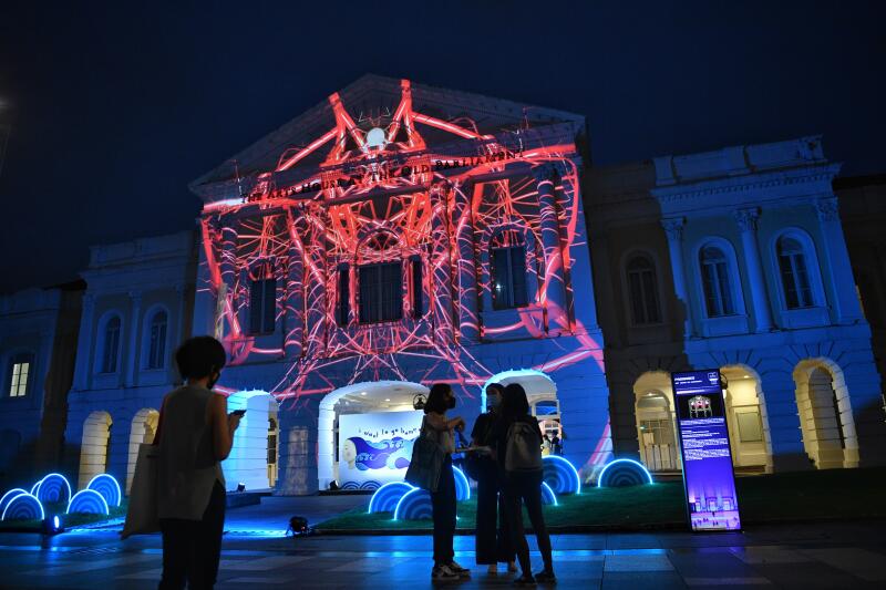 Joanne Ho and W.Y. Huang's (Re)rooting (above), a multimedia work designed using machine learning frameworks, covers the National Gallery Singapore facade. Inside the museum, paintings from the National Collection come alive through an augmented-reality app.