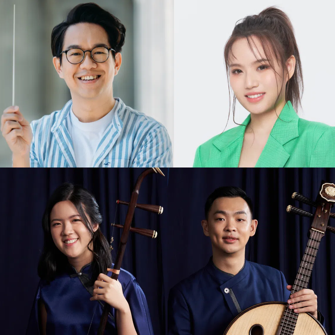 (Clockwise, from top left) Ding Yi Music Company's resident conductor Dedric Wong, singer-songwriter Boon Hui Lu, ruan musician Wong Wai Kit and huqin musician Chen Ning will appear in Ding Yi's Happy Chinese New Year Concert.