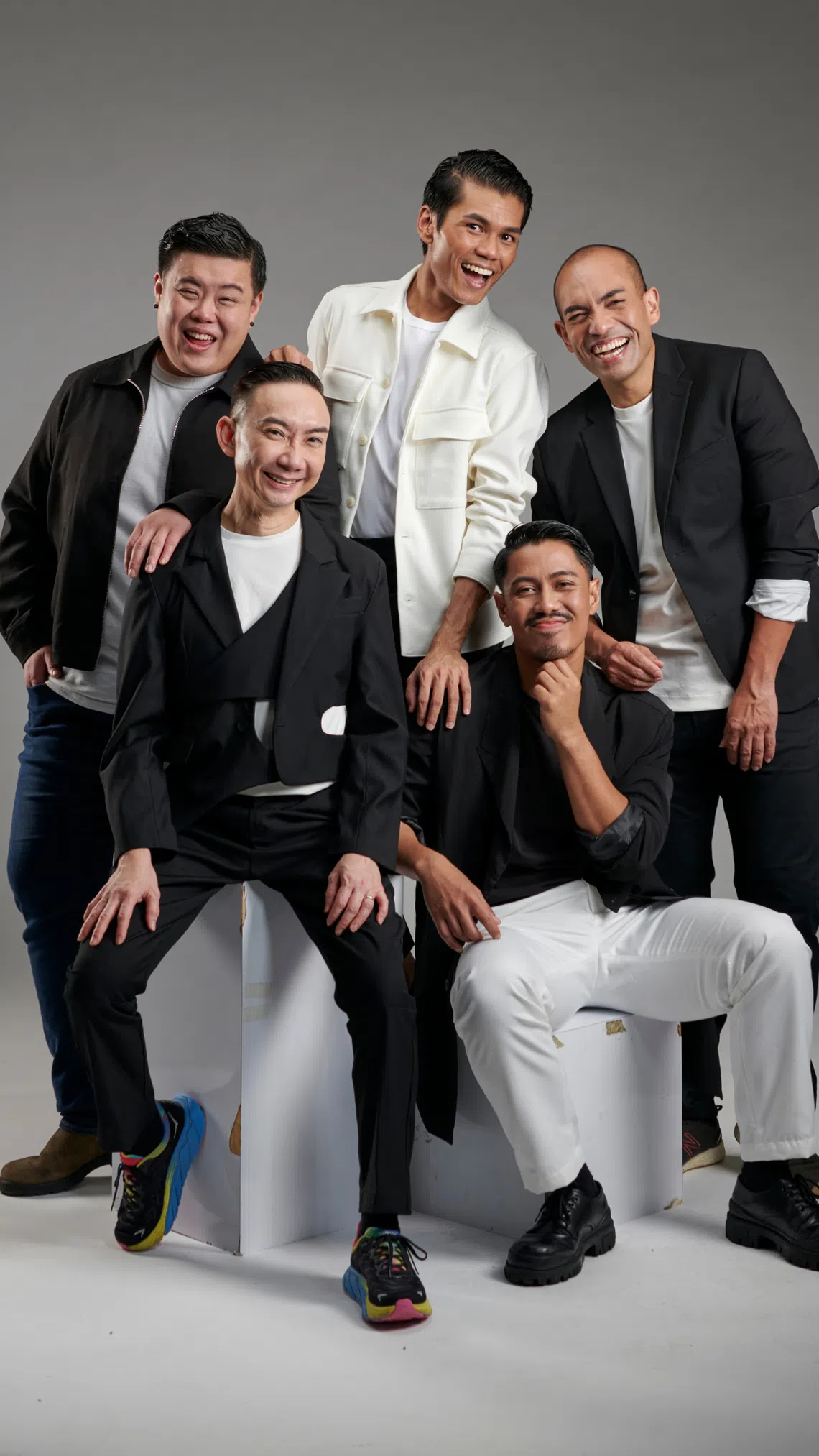 The cast of A French Kiss In Singapore (clockwise from top left) – Andrew Marko, Rino Junior John, Dwayne Lau, Amin Alifin and Hossan Leong.