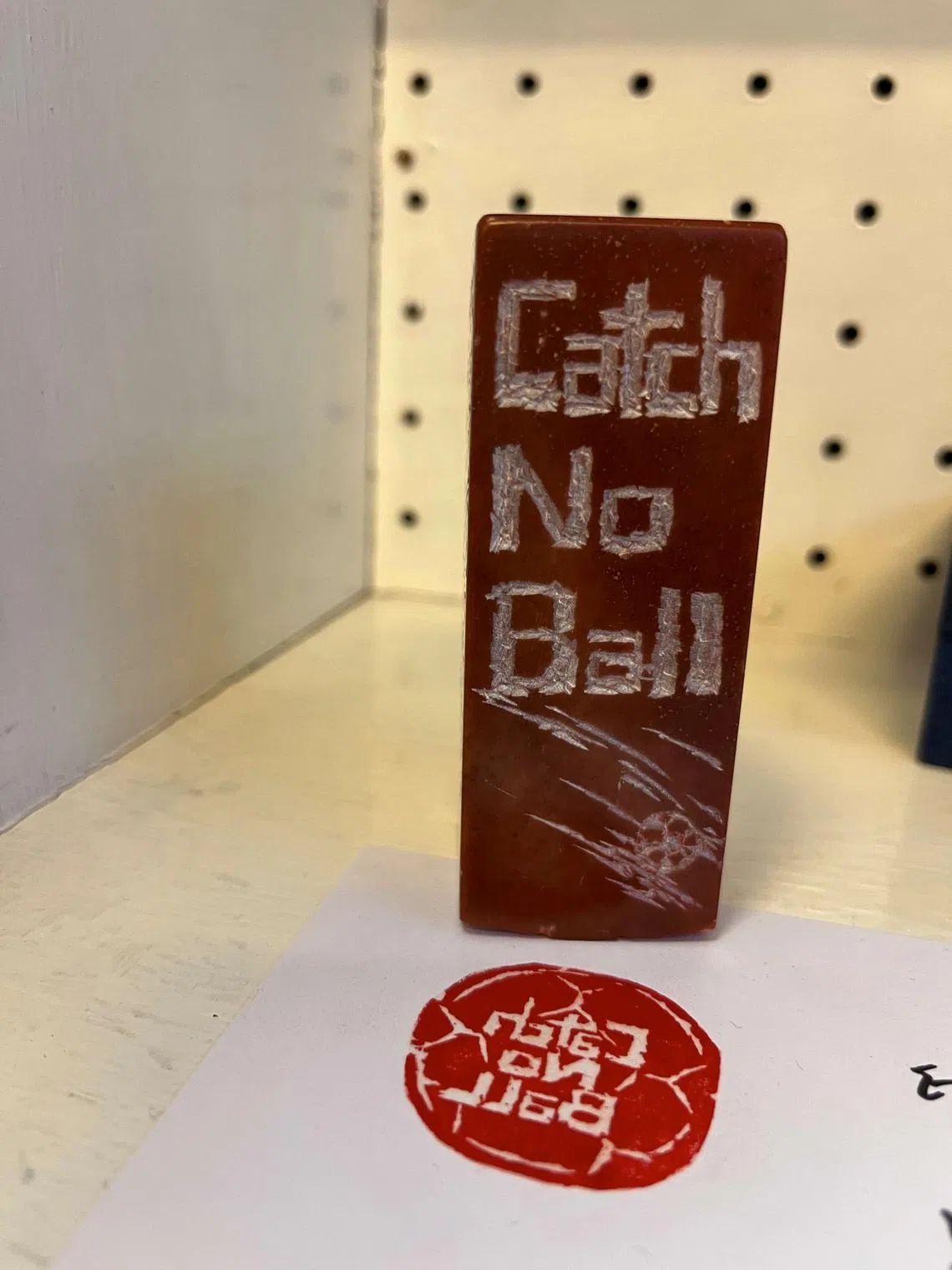 A Catch No Ball seal is one of 54 seal carvings by five Singapore artists on display.