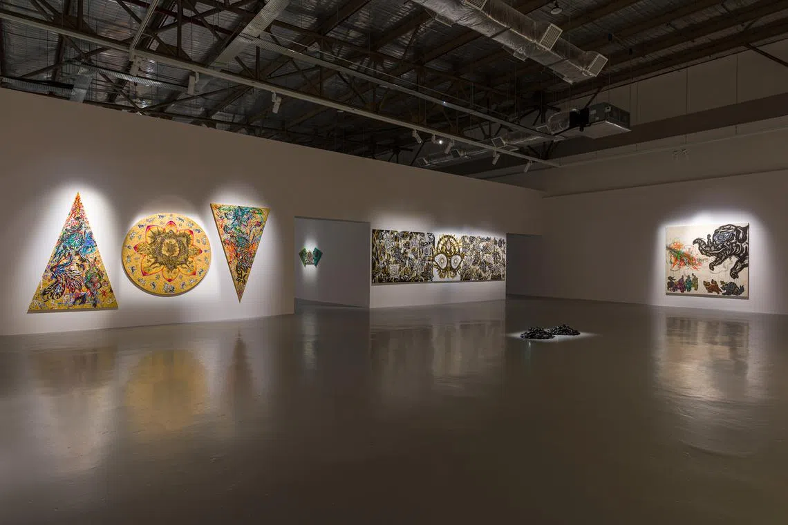 Set in triptychs and mandalas, ferocious guardians from Japanese mythology and folklore populate her canvases, from the dragon-like shinshi of Shinto shrines to wolf spirits that had guided her home as a child in Nagano prefecture, Japan.