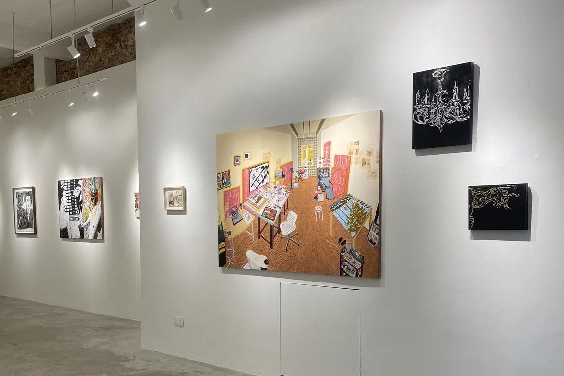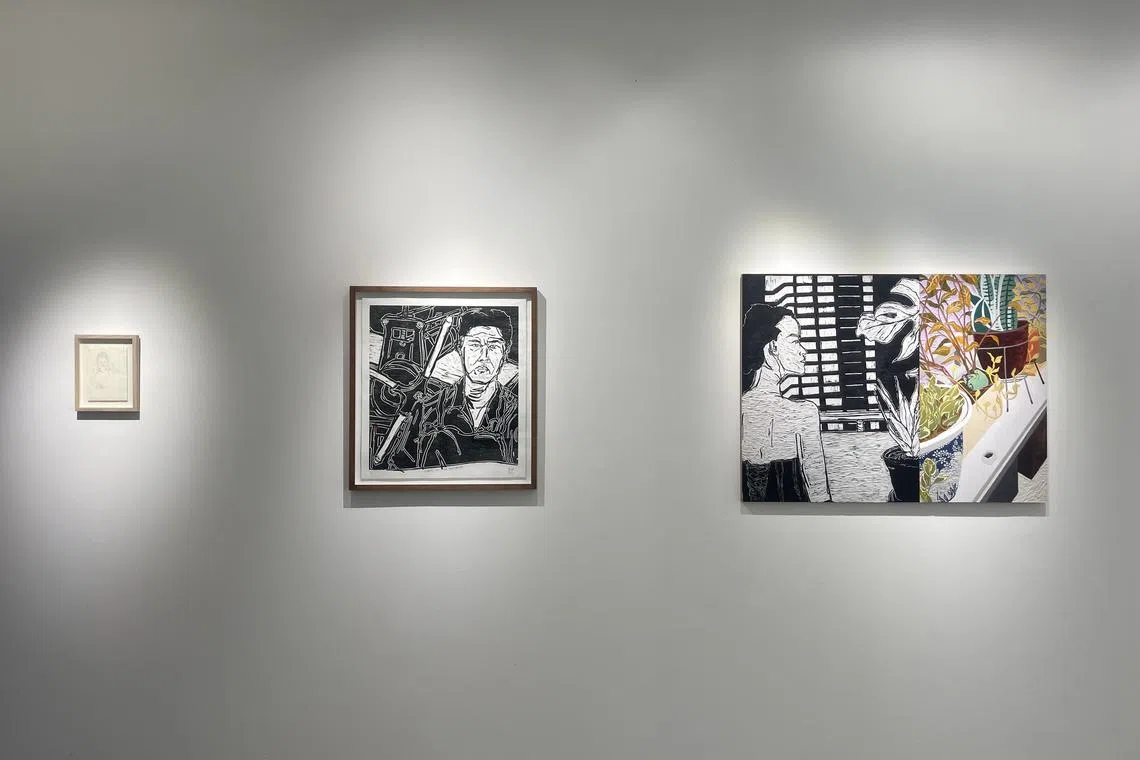 Zhang’s stark black-and-white woodblocks carvings serve as noir counterweights to Lim’s more playful and colourful whimsical perspectives of various rooms.