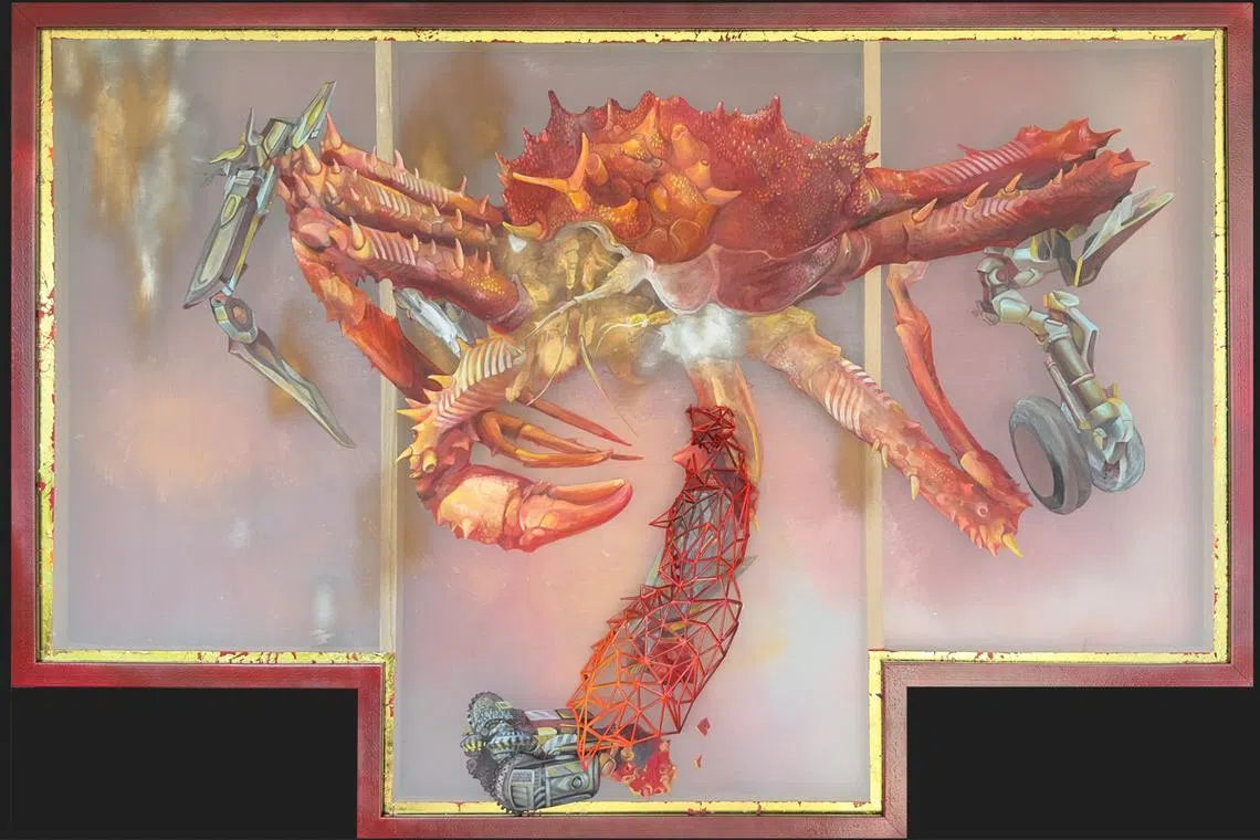 The 18 contemporary works are by Nafa artists and designers, ranging from artificial intelligence-guided fashion print designs to a 3D print of a crab mounted on a wooden panel – an exploration of the tension between natural evolution and bodily enhancement.