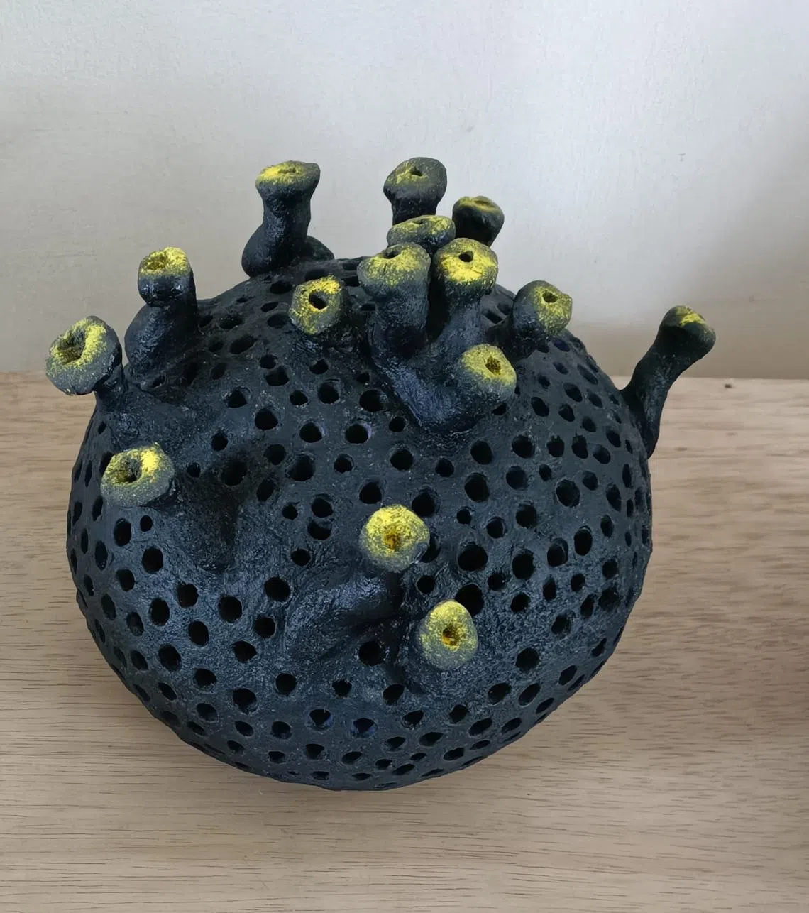 Cultural Medallion recipient Han Sai Por is represented by the fireclay moulds of her microorganisms series. The protrusions from her perforated models are reminiscent of mushrooms or trees in a spherical forest, and continue her interest in deforestation, changing landscapes and nature.
