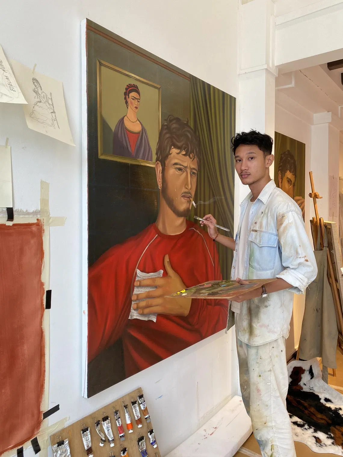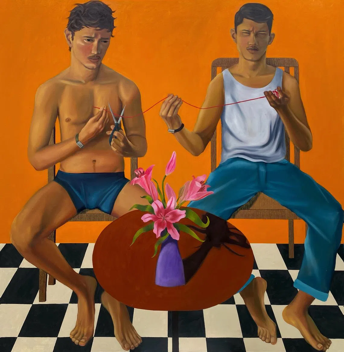 His works also often allude to motifs in Mexican artist Frida Kahlo’s works. His painting If Touch Is What I Desire, Cut It Off (2023), for example, references Kahlo’s The Two Fridas (1939).