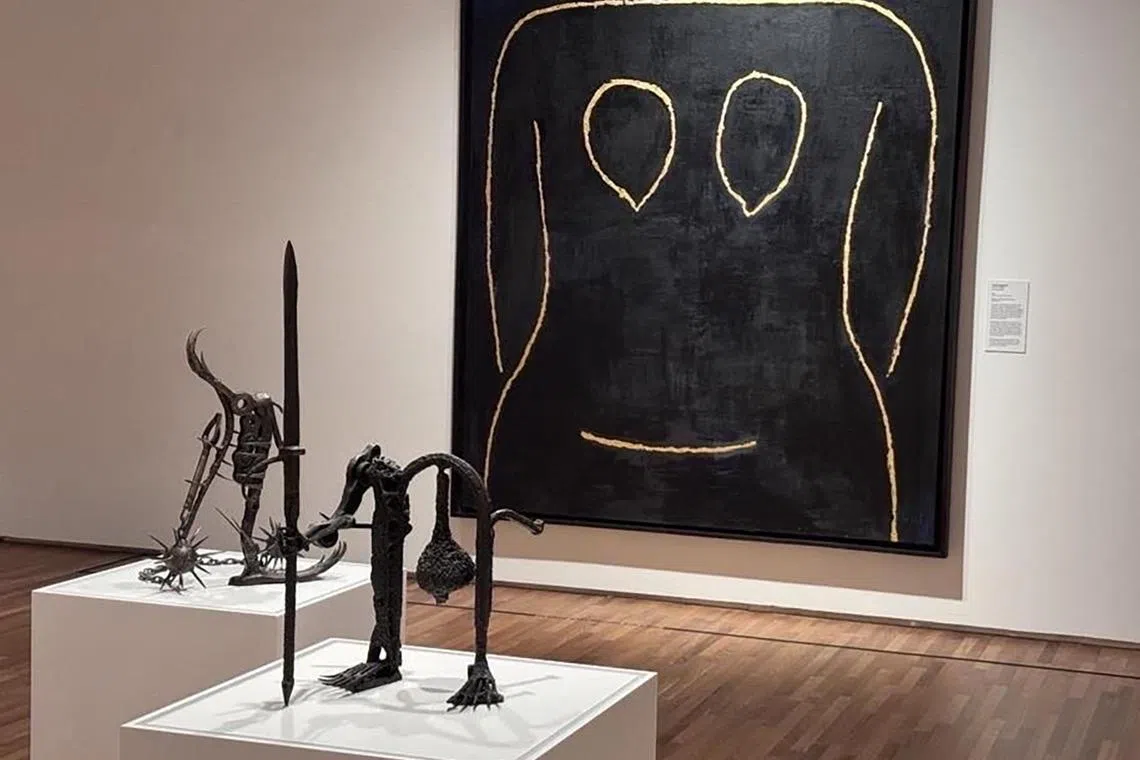 Malaysian sculptor Raja Aziddin Raja Shahriman’s Killing Tools series (foreground) and Thai artist Pinaree Sanpitak’s monumental sketch Smiling Body (background).
