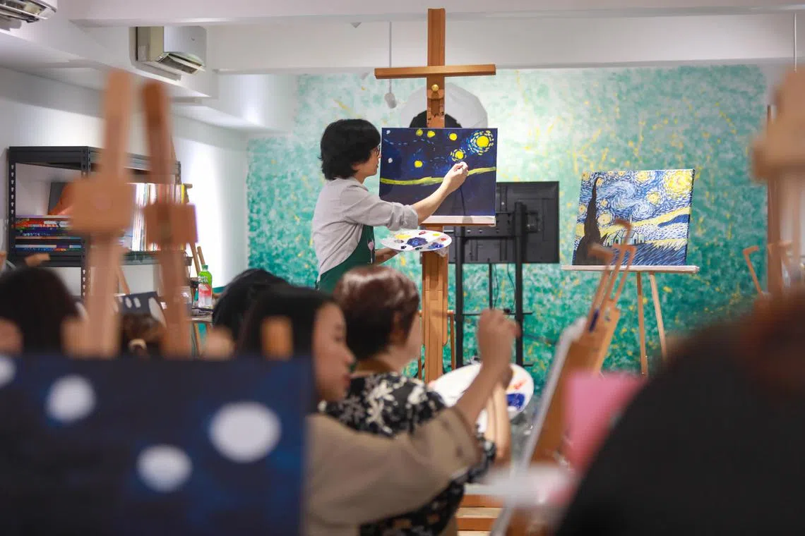 Paintblush art instructor Justin Ong teaching a class to recreate Van Gogh’s Starry Night painting.
