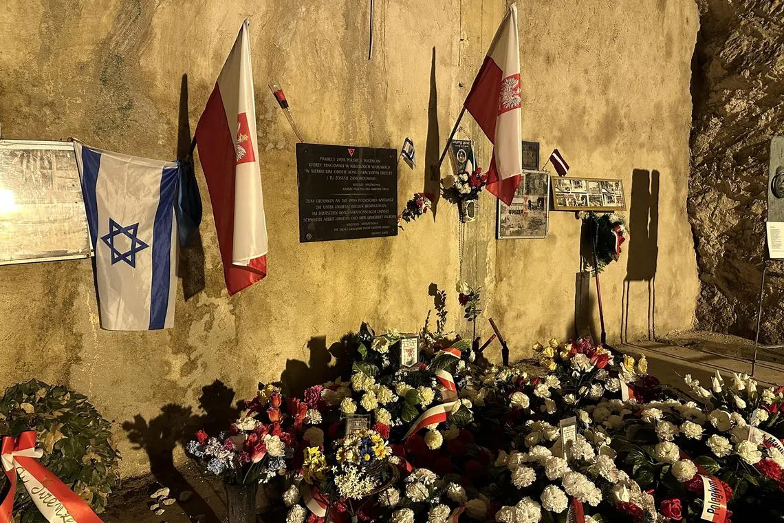 Flowers and signs commemorate concentration camp victims in a tunnel in Ebensee.