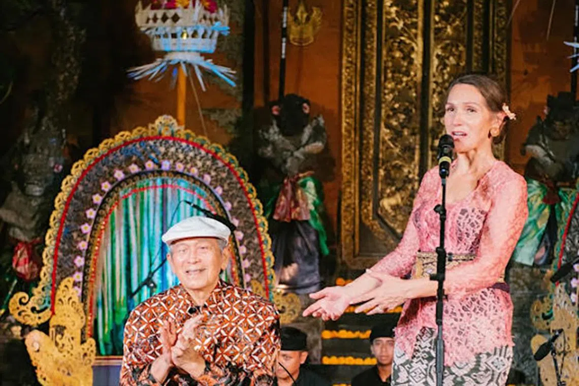 Festival director Janet DeNeefe (right) presenting the Lifelong Achievement Award to Balinese author and playwright Putu Wijaya at the festival opening gala at Ubud Palace.