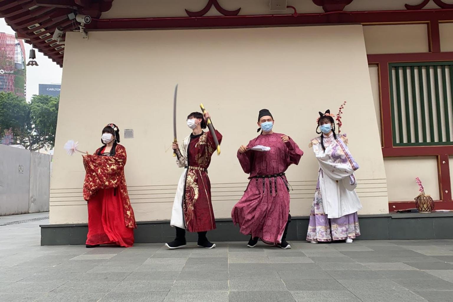 (From left) Hanfu lovers Huang Jiachen, Xu Weiyi, Jeffrey Liu and Zhan Yue posing in hanfu at Chinatown.