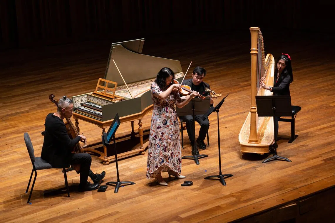 (From left) Leslie Tan (baroque cello), Brenda Koh (baroque violin), Mervyn Lee (baroque guitar) and Vanessa Irwanto (harp) playing The Assumption Of Mary.