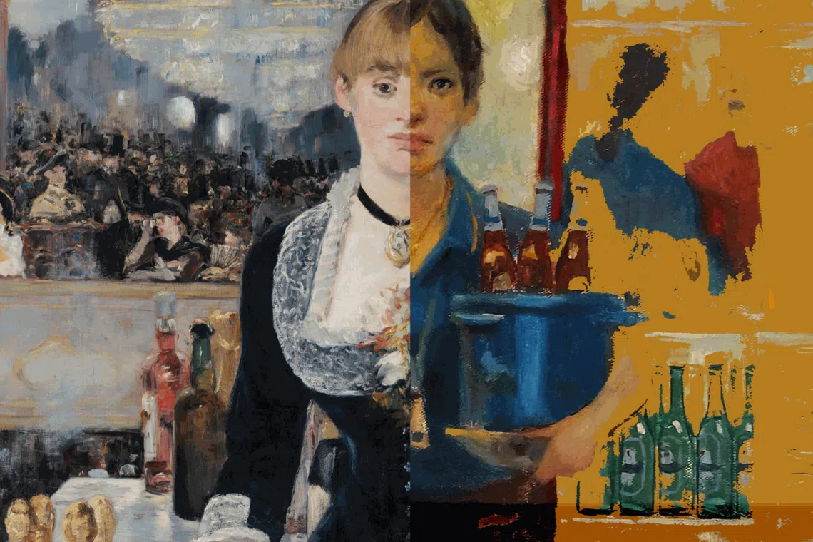 A painting by Singapore artist Samuel Chen supplants Edouard Manet’s barmaid with a coffee-shop beer auntie. This is a pastiche of his and Manet’s original.