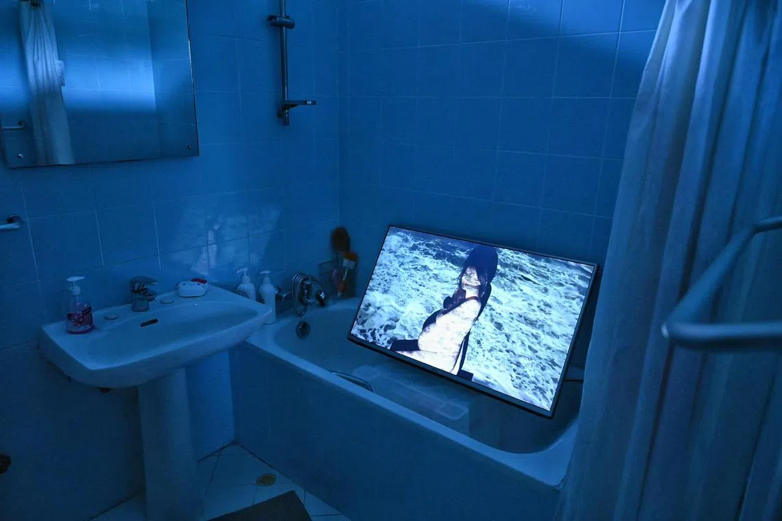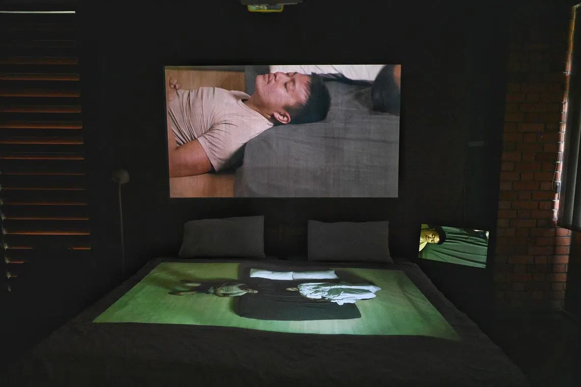 In one of the house’s four bedrooms, a three-channel video installation by Tan plays on the bed and two other screens. In Bedtime (2023), Tan wonders about the dynamics of movement in bed.
