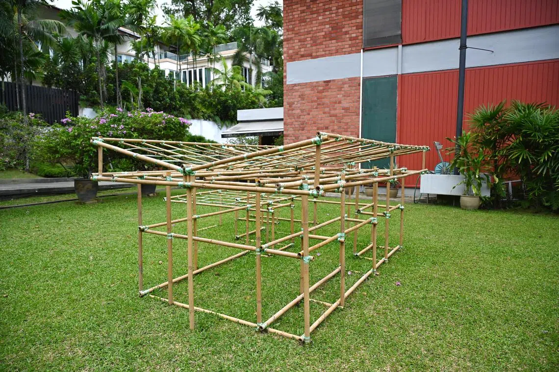 The house is replicated in artist Catherine Hu’s Garden Varieties (2023), a miniature model made of bamboo and raffia that feels bereft of domestic life. But it is also generously open, as a patient observer can spot monitor lizards, junglefowl, frogs and butterflies making a temporary home in it.