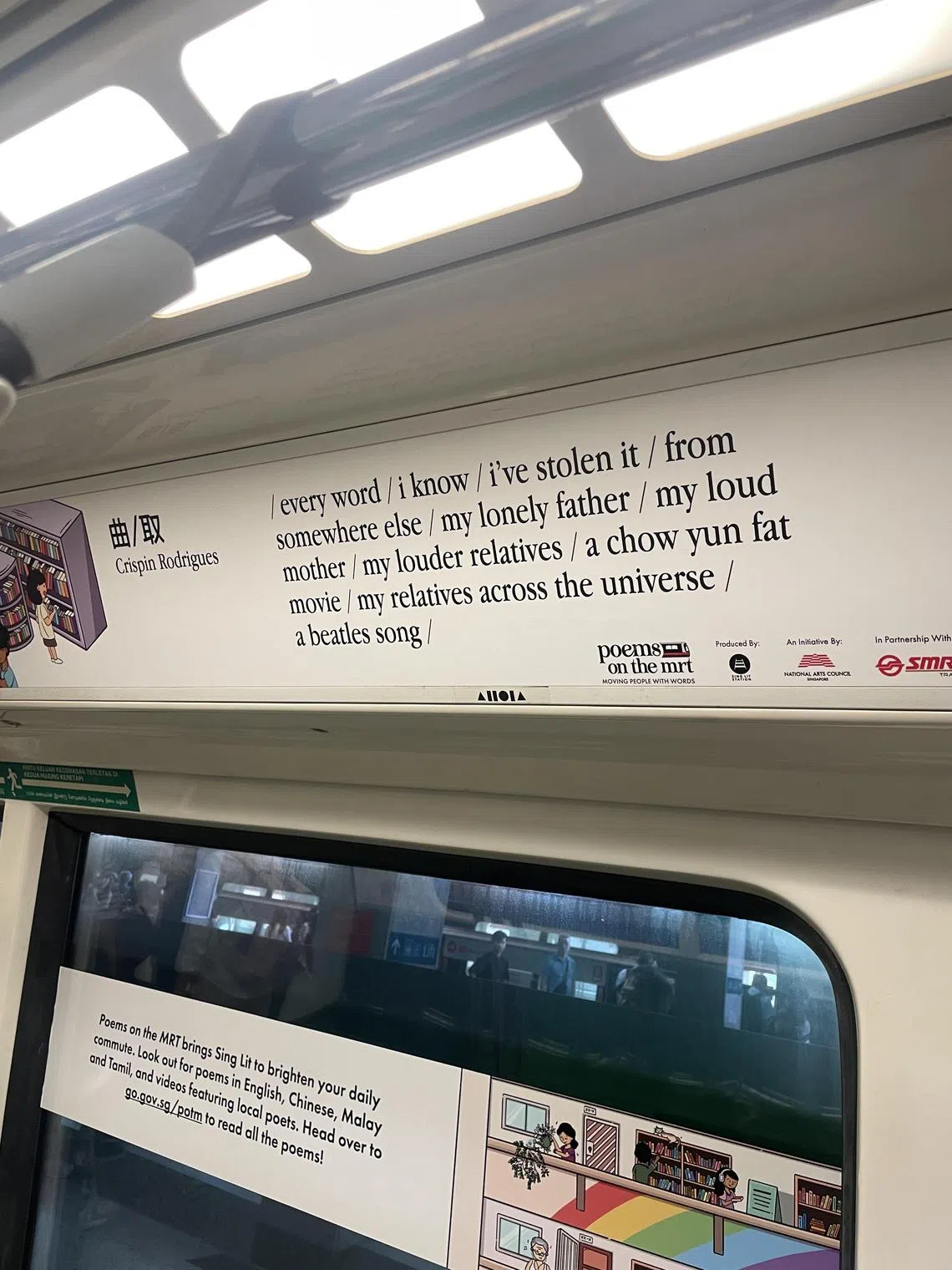 In the largest effort to promote Singapore Literature (SingLit) to date, more than 100 poem snippets have been stuck on trains and stations of the SMRT-operated North-South, East-West and Circle lines.