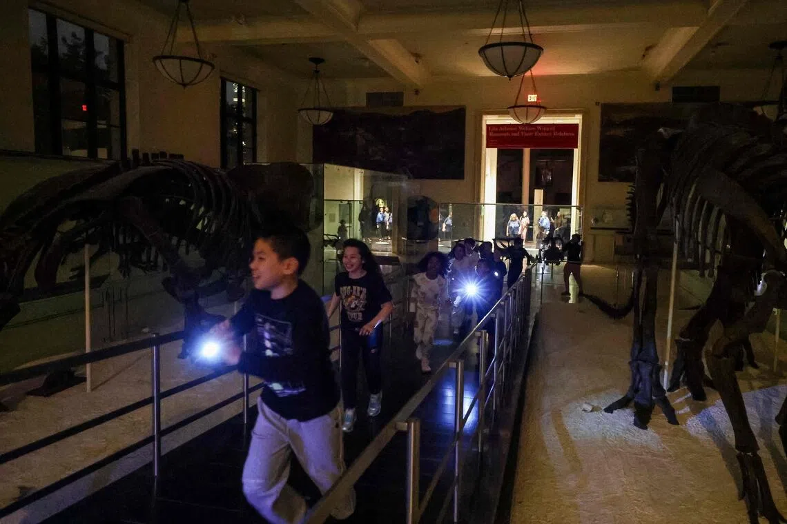NEW YORK – It is nearly 10pm on Friday night, and a group of children shine their torches on the imposing skeleton of a Tyrannosaurus rex.