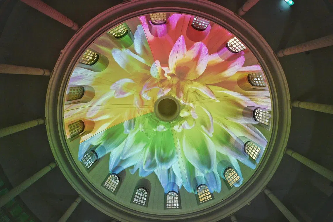Botanica by UK artists Studio McGuire is a floral light projection on the interior dome of the Rotunda Library at National Gallery Singapore.