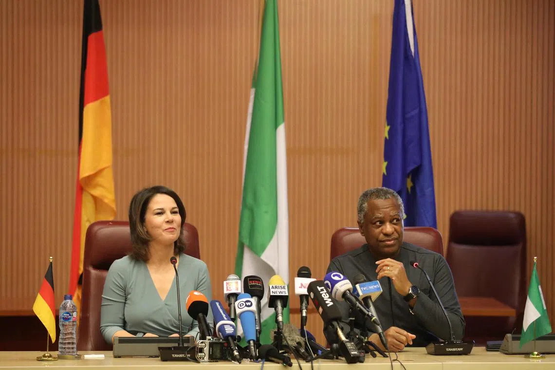 Germany Federal Foreign Minister Annalena Baerbock and Nigeria Minister of Foreign Affairs Geoffrey Onyeama (R) during the handing over of Benin bronzes in Abuja, Nigeria, on Dec 20, 2022.