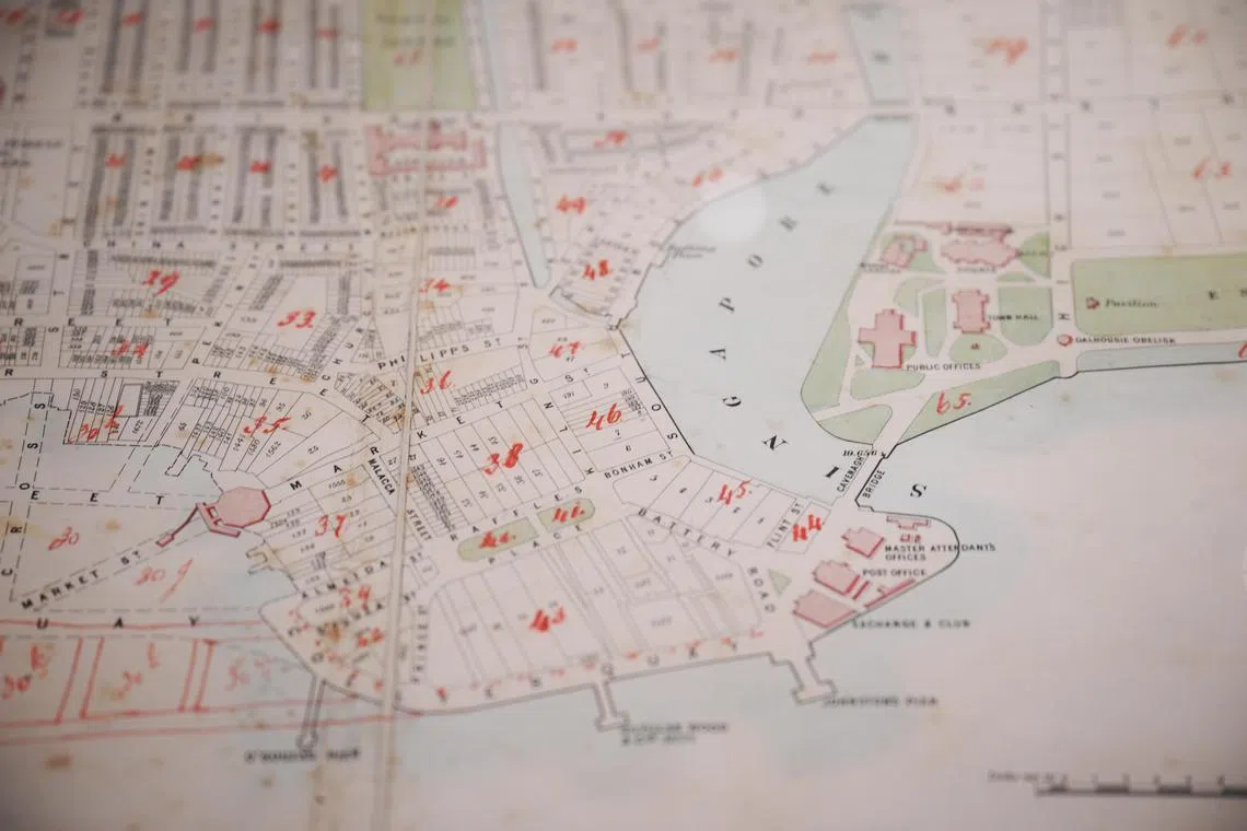 Pay attention to the map’s title, and you will see the signature of Hancock Thomas Haughton, a civil servant who held multiple positions, including collector of land revenues, and who worked with McCallum. What is more intriguing are the notations in red, marking out road name changes for the land reclaimed from the Telok Ayer basin that became Singapore’s Central Business District in the 19th and 20th centuries. You can see amendments where Robinson Quay became Robinson Road, and further extensions for Raffles Quay.