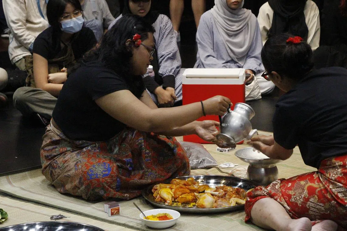 Then there is the tenderness of mly mkn mly – a collaboration between visual artist Lina Adam and young artist Nur Surianita. The duo sit across each other in an absorbing silence, marinating a chicken in a ritual that foregrounds the labour behind food.