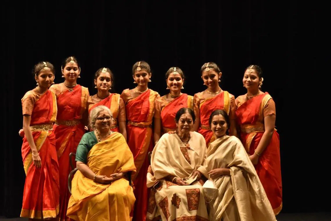 Mrs Karthigesu (foreground, middle) with Ms Gayatri Sriram (foreground, right) at the Shrutilaya School of Dance Singapore’s annual day event in January 2023.
