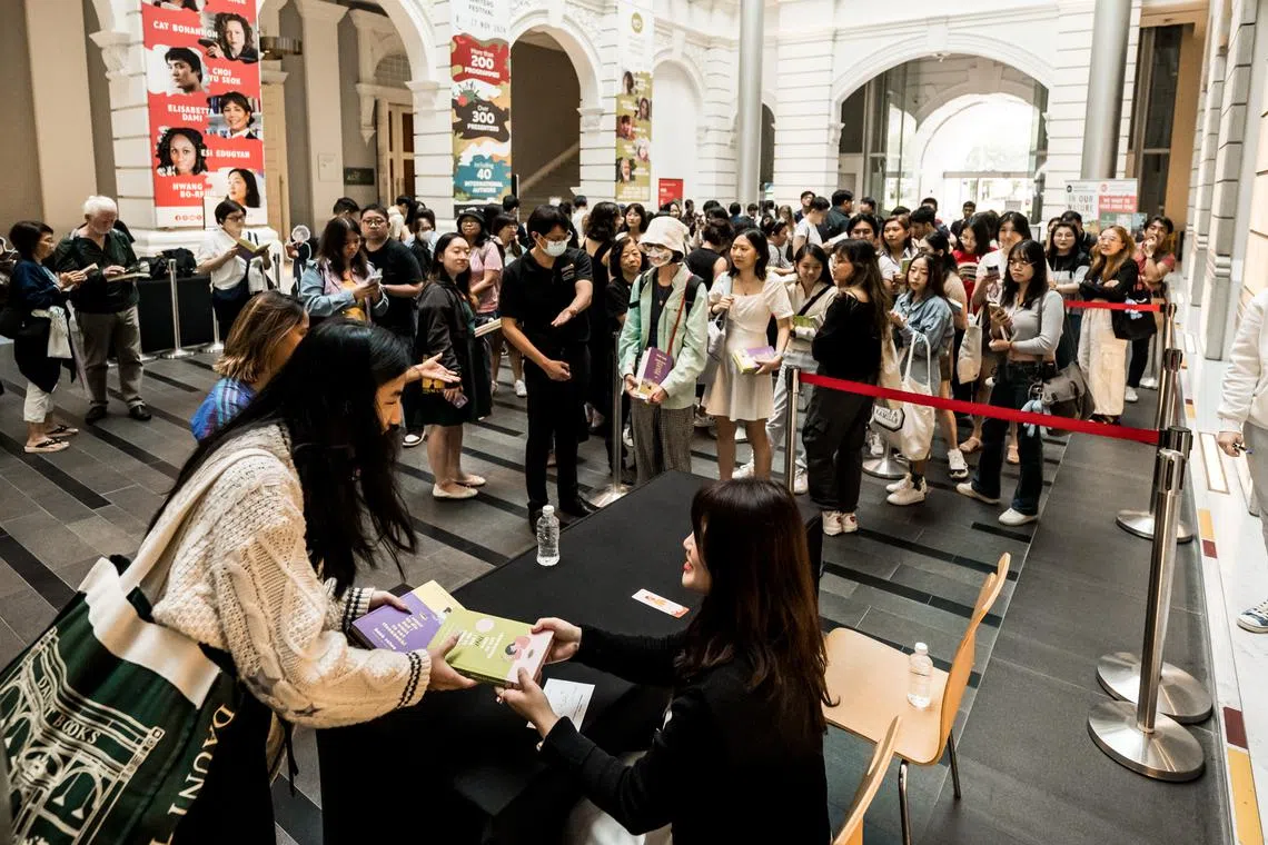 Festivalgoers could buy books, then join the line at the back entrance of Gallery II. SWF staff and volunteers performed crowd control, easing traffic and increasing efficiency by redirecting people to the correct queues when multiple signings were happening. – Charmaine Lim