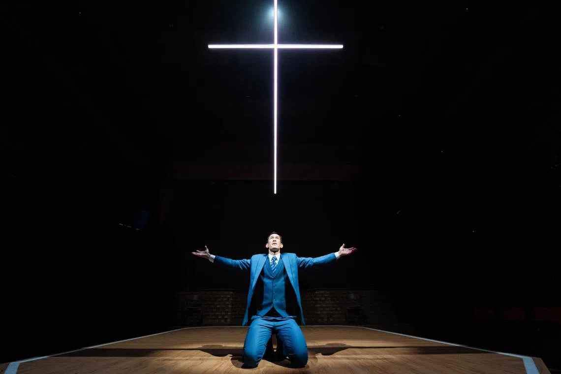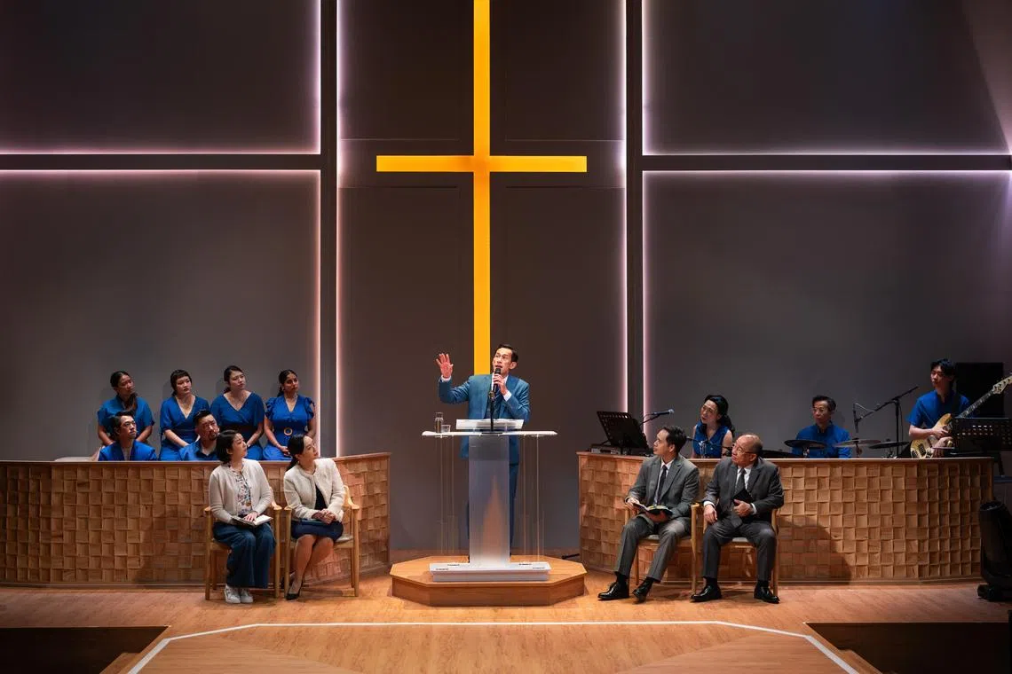 Director Glen Goei – who spoke to The Straits Times about how he almost devoted his life to full-time church ministry – choreographs a pitch-perfect Sunday service. Audiences are welcomed in with an ongoing pre-show set by an ever-present seven-piece choir and three-piece band who are all in matching cerulean and leading the congregation in worship.