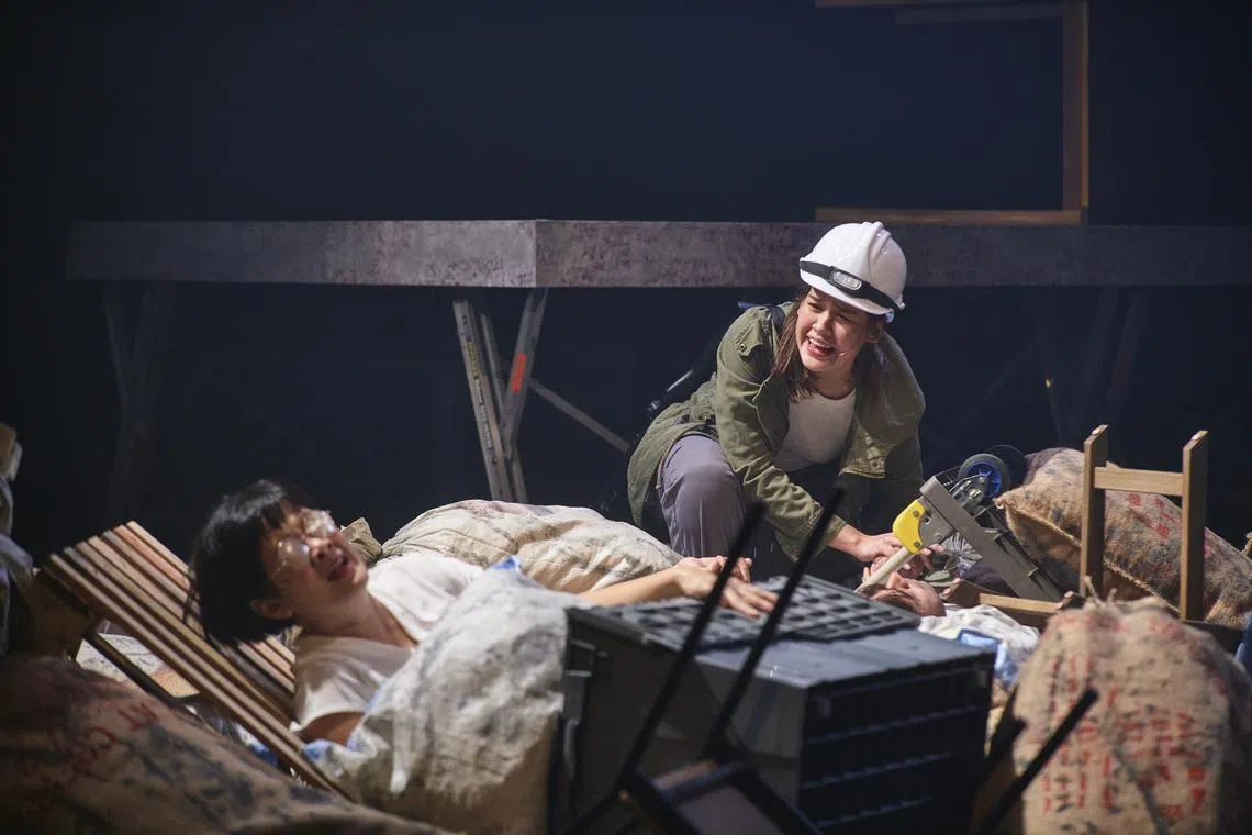 (From left) Karen Tan and Arielle Jasmine Van Zuijlen play multiple characters in a script about the unnerving breakdown of social order.