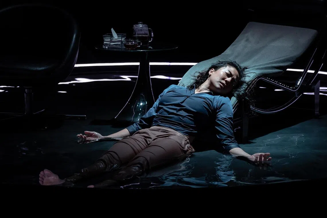 Petrina Dawn Tan’s set places her therapy chair in the middle of a pool, an invention that makes for diluvian drama. At the play’s climax, Sng thrashes in it amid the immensity of Jing Ng’s thunderstorm soundscape. Later, Sng slips from the reclining chair into the pool as enervating depression threatens to drown her, in one of the few moments of real impact.