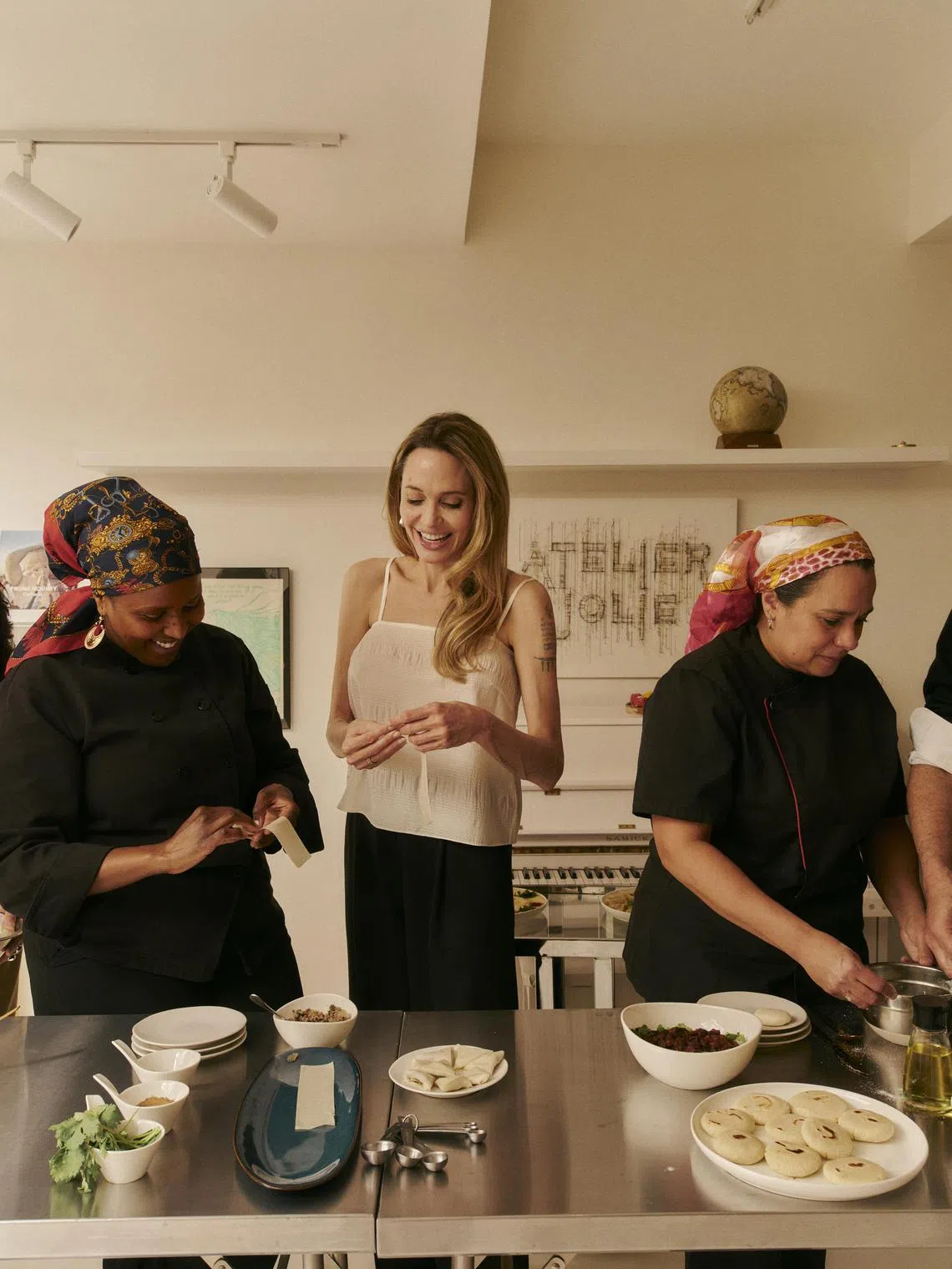 Chef Gladys Shahtou (left) helps Angelina Jolie (centre) make sambuxa, a spiced Sudanese stuffed pastry, at Atelier Jolie on March 7, 2025. The actress is building a community of artists, thinkers and doers of all kinds in a storied building in downtown Manhattan.