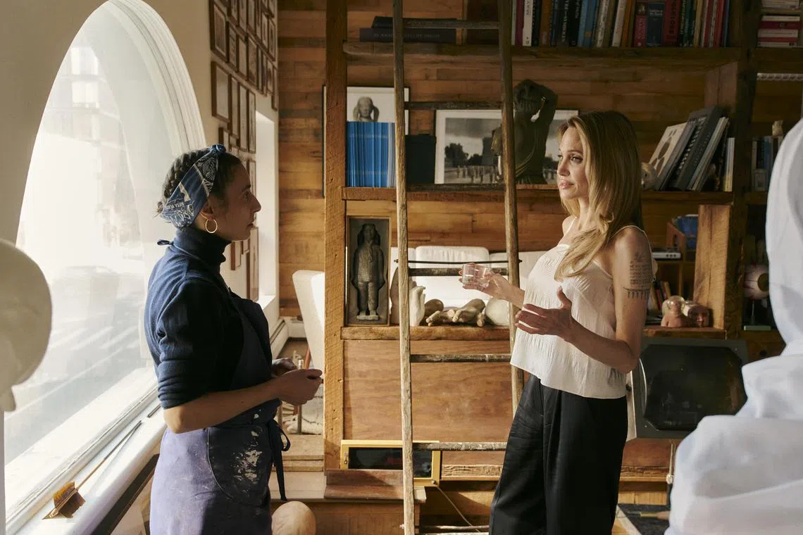 Angelina Jolie (right) speaks with Prune Nourry, the artist-in-residence, in her second-floor studio at Atelier Jolie.
