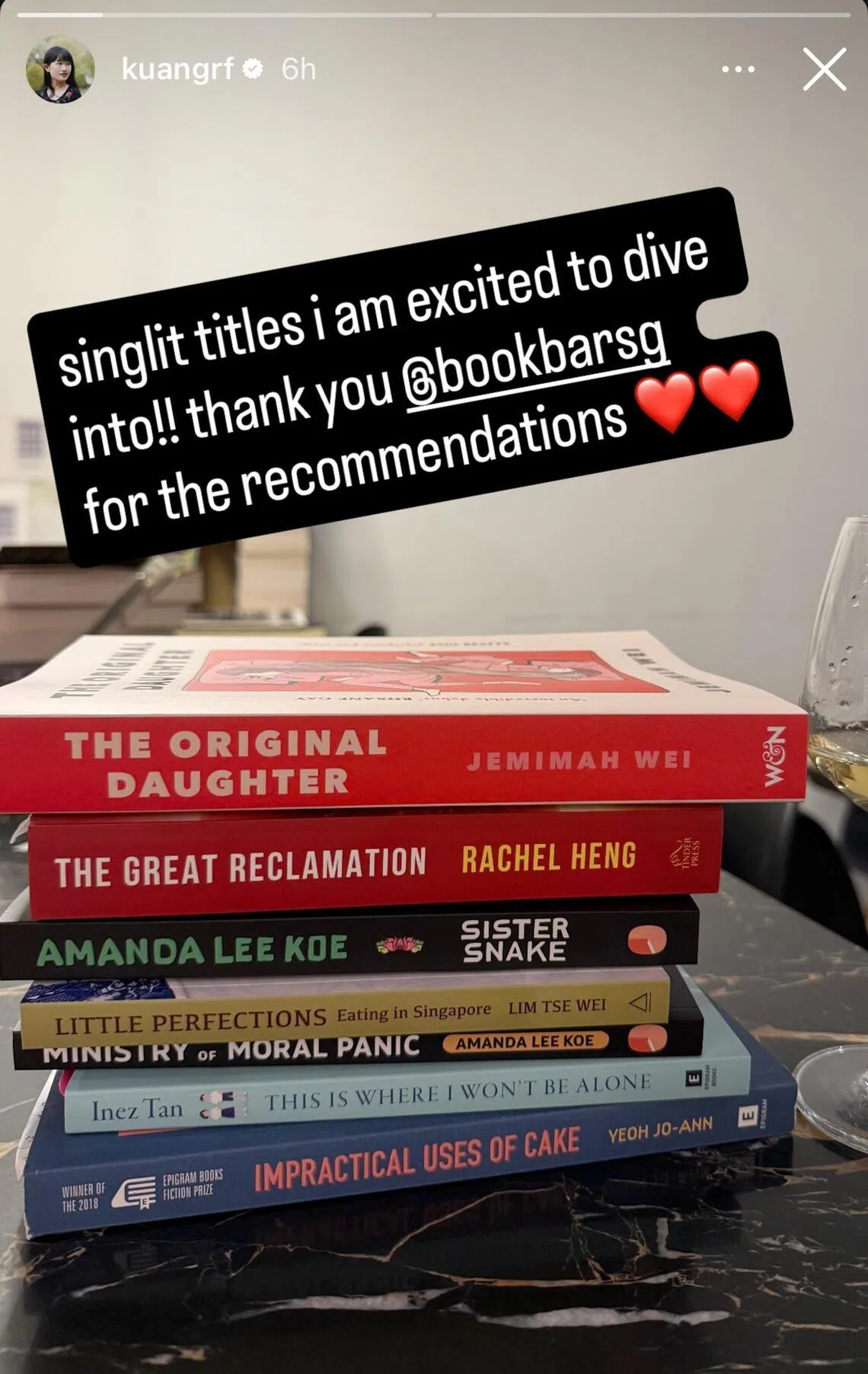 Kuang visited Book Bar, where she bought an entire stack of SingLit books, posting them on her Instagram Story. The author also took time out to explore Gardens by the Bay and the Singapore Oceanarium, posting short videos in her farewell note to the Republic.