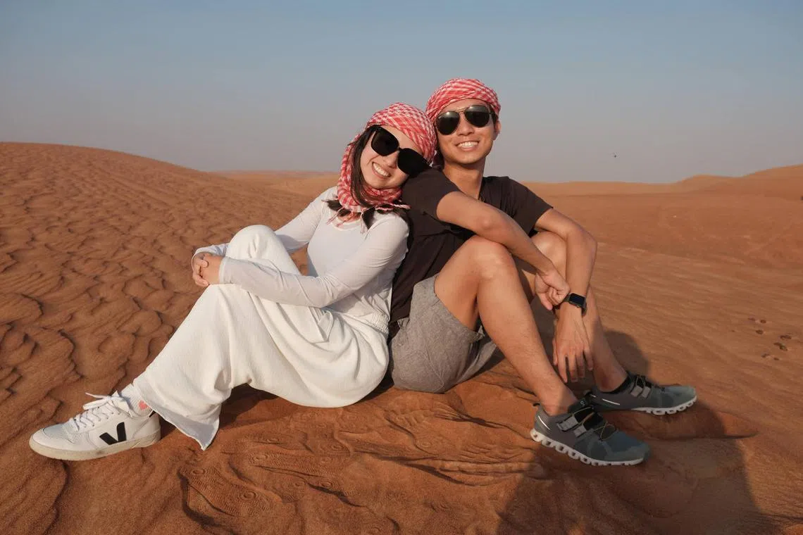 Ms Marilyn Chew and Mr Low Jian Sheng, who run travel blog and Instagram page @Shrugmyshoulder, in a Dubai desert.