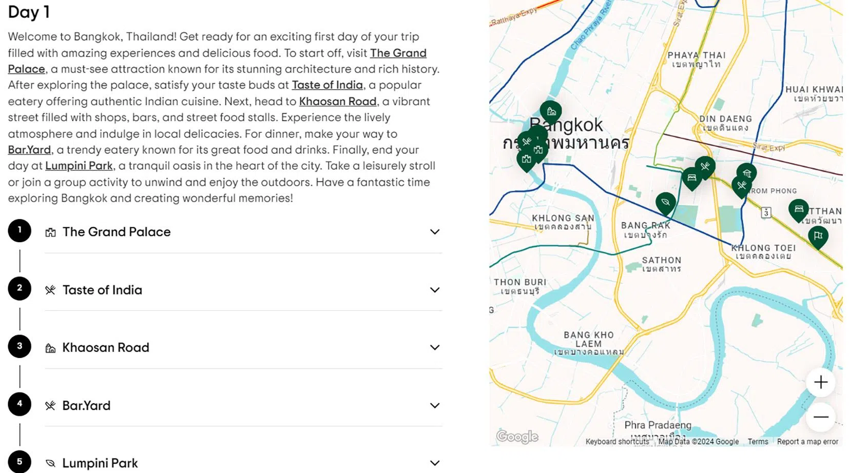 For example, Tripadvisor’s AI trip builder recommended starting the day at Bangkok’s Grand Palace, followed by lunch at Taste of India for “authentic Indian cuisine” before a midday visit to legendary nightlife area Khaosan Road, dining at the tiki-themed rooftop eatery Bar.Yard, and winding down at Lumpini Park.