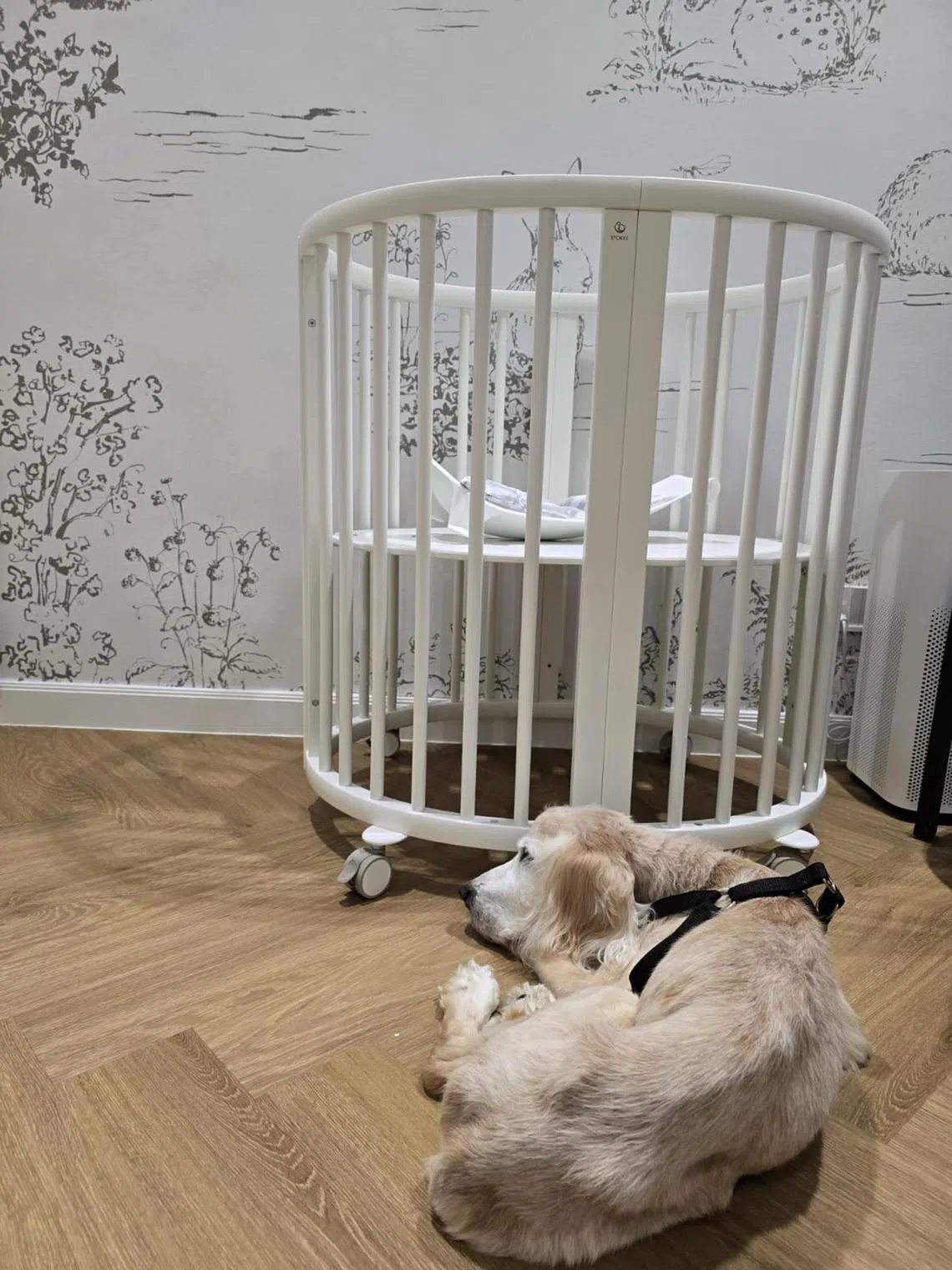 Although he sleeps with the couple, when he hears her fussing, he would stand up, perk up his ears, tilt his head and go to the bedroom door.