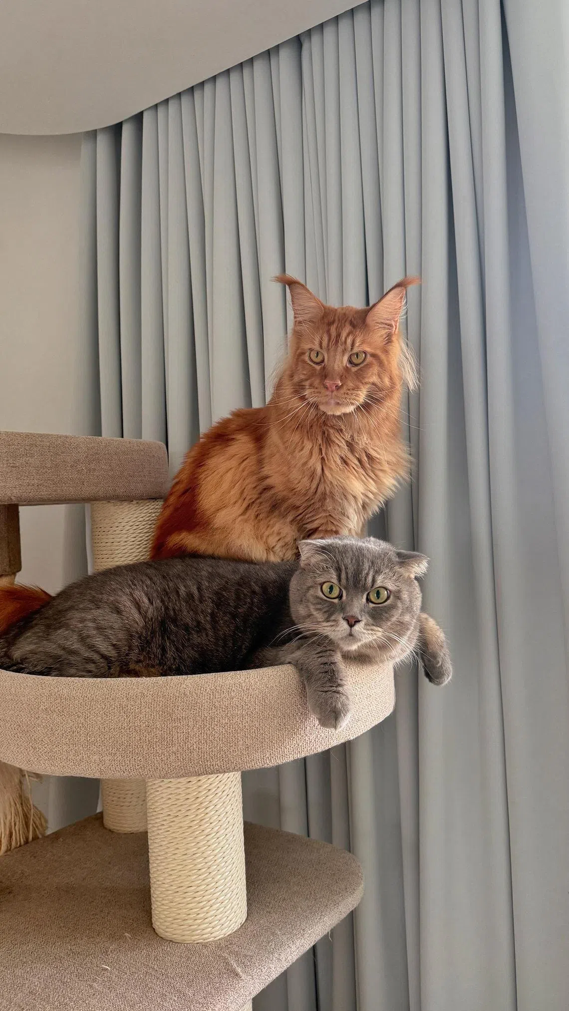 Kaoru is a ginger Maine Coon and Tomu is a grey tabby Scottish Fold.