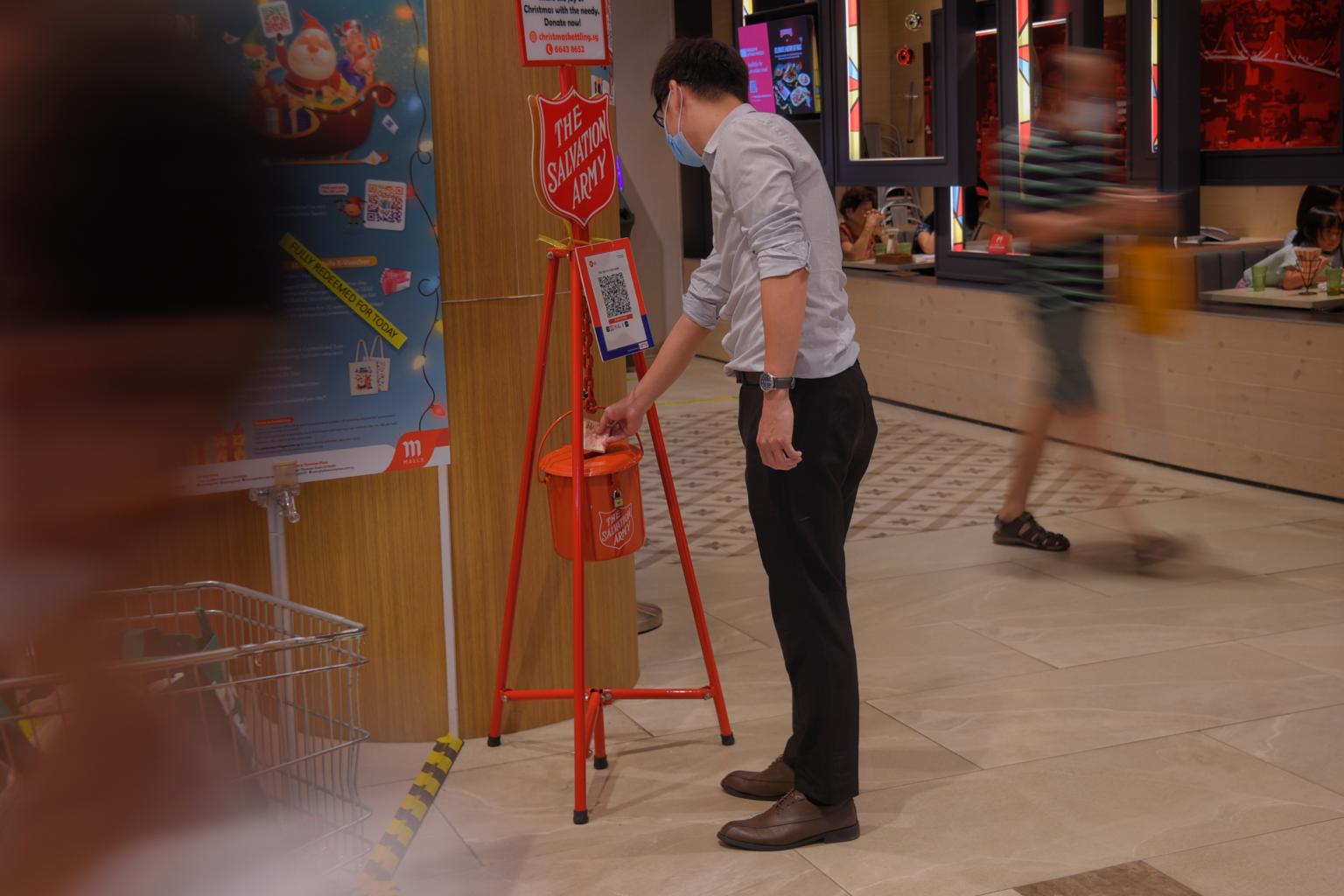 Members of the public can drop cash into the kettle pots or scan the QR code on them to make a donation. They can also give online at christmaskettling.sg.