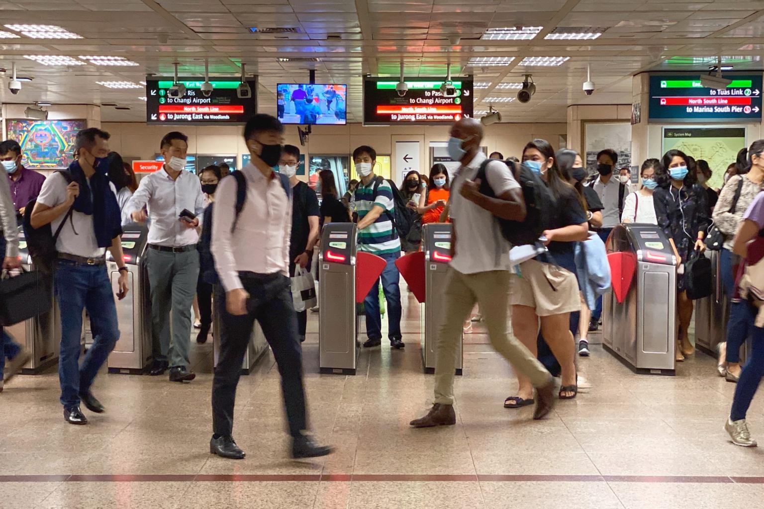 Commuters at Raffles Place MRT station on March 30, 2021.