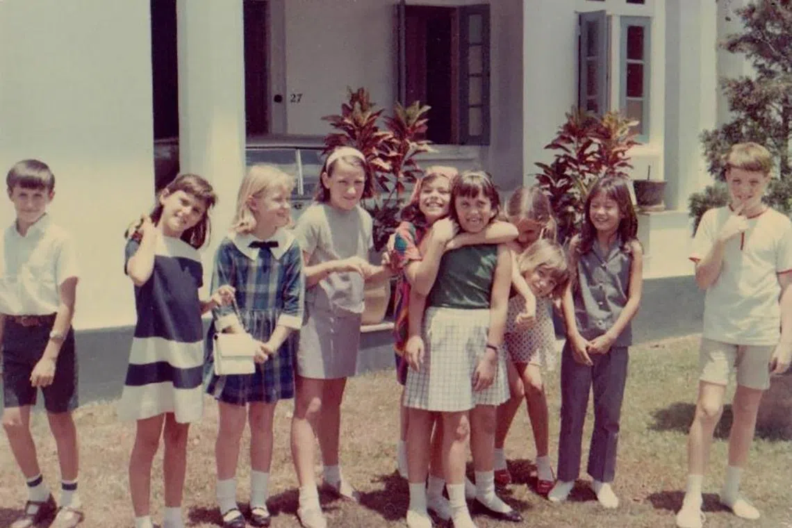 A young Andrea Swift (third from right, bending down) at a party with her classmates at her family’s bungalow in Singapore in 1968.