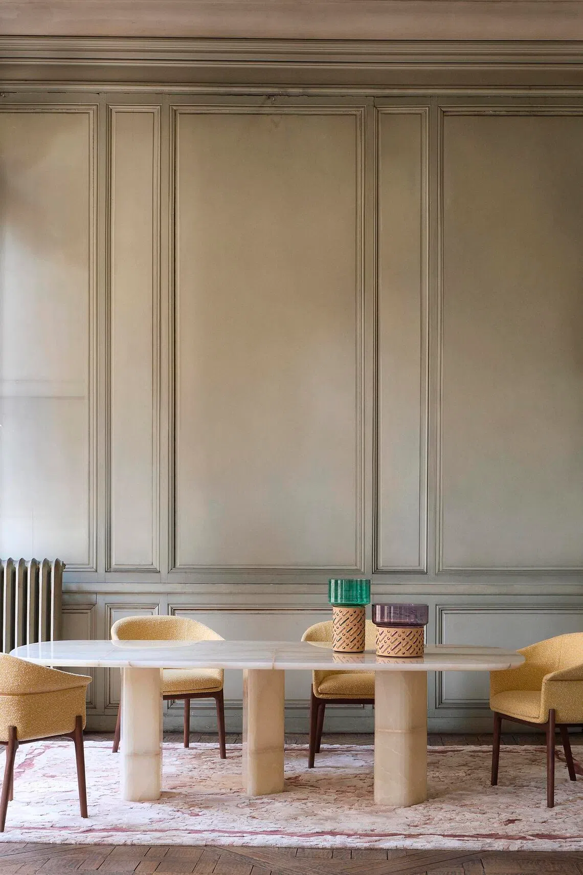 The Atlas Table by Cristian Mohaded for Louis Vuitton is a sculptural piece crafted from a blend of onyx and travertine.