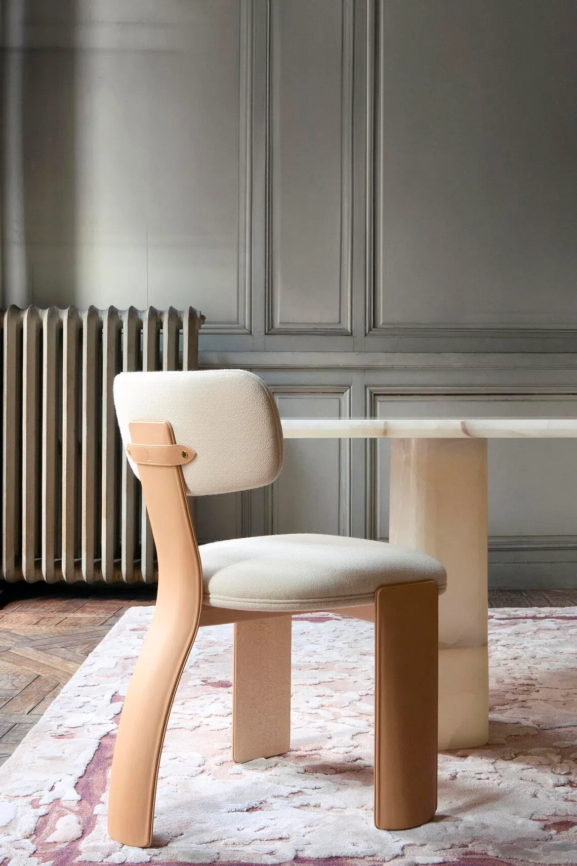 This is nowhere more evident than in his design for the Pegaso Chair, which is part of the LV Home Collections. The three-legged seater features a sleek, curved leg as back support.