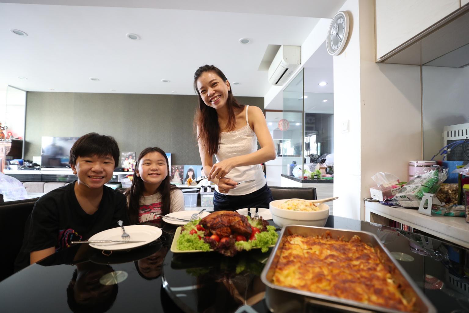 Katherine Chua is joined by her children Naomi and Karlsson Tan as she serves a meal of roasted chicken, potato gratin and shrimp fried rice.